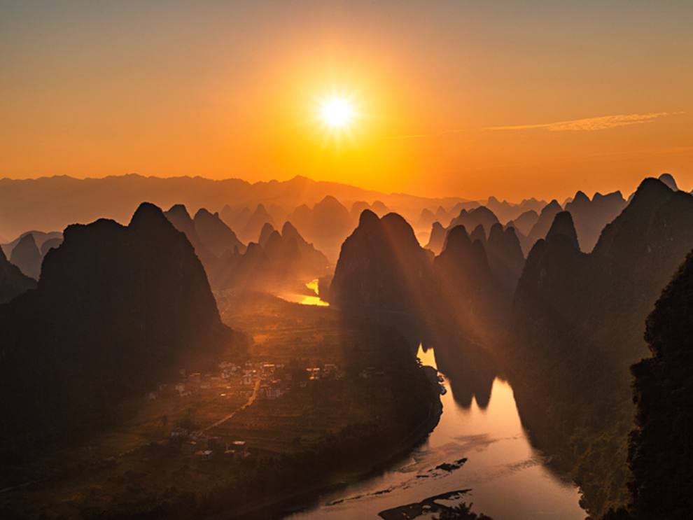 上午:早起,登相公山,俯拍漓江第一湾日出风光:这里的光、影、云海、日出、彩霞吸引了无数的摄影家和摄影爱好者。此处可用超广角镜头拍摄大气的云海山峰场景,也可以用长焦镜头表现孤峰扁舟的意境。拍摄完毕,下山用早餐,调整休息。