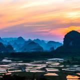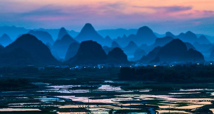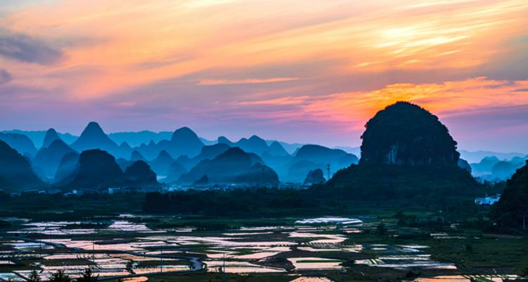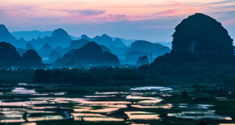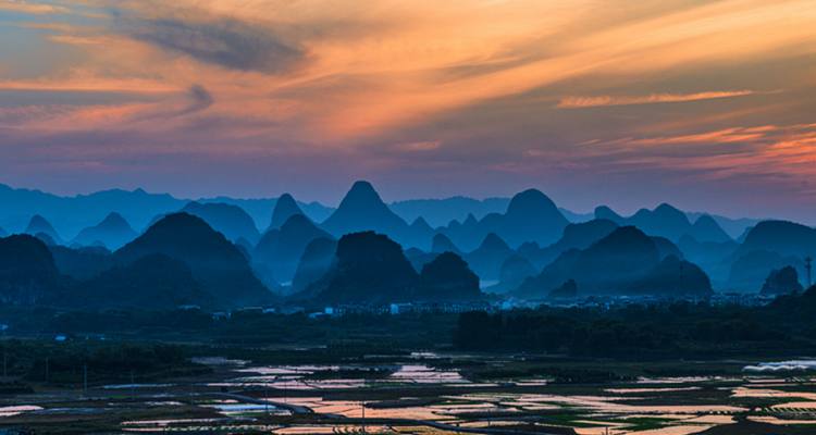 在阳朔的葡萄乡境内,有一大片稻田,每年春天插秧之前,这里阡陌纵横,田畴似锦,一块块水田连成一片,一望无边,景色蔚为壮观神奇。特别是在夕阳下,随意爬上一个山头,只见远处群山层层叠叠,近处田园绿光粼粼,是不可错过的拍摄好时机。
