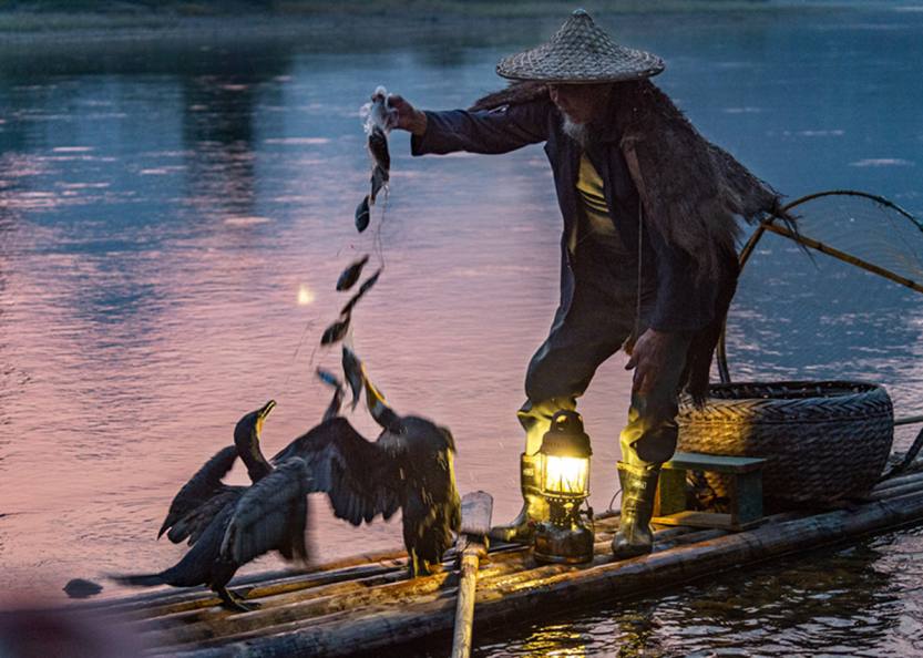 青山、绿水、竹排、煤油灯、斗笠、蓑衣、鸬鹚。。。。。。这种漓江如诗如画的景观总让人想起——过去生活在江边的渔民,每当夜幕降临,三五成群,划着点有渔灯的竹排,赶着鱼鹰在江上捕鱼的情景,鱼鹰潜入水中,一条接着一条叼鱼出水……江面上,山影重重,渔火点点,渔歌阵阵,构成了一幅迷人的夜猎图。现在以打鱼为生的渔民很少了,那些诗一样的画面也很难重现,要拍摄漓江渔火需要事先安排,只有这样才能达到最佳的拍摄效果。